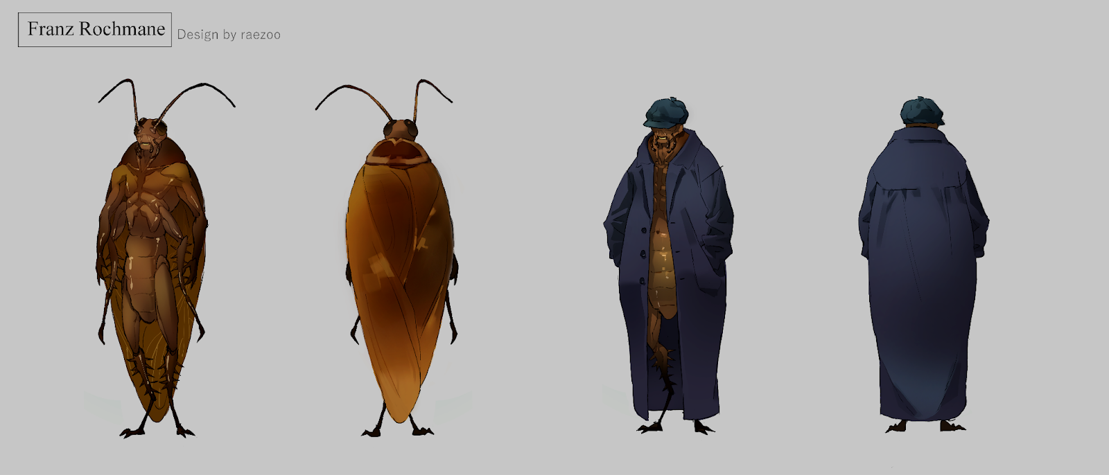 Visual description: Mr.Rochmane is a tall bipedal cockroach as previously mentioned, he often wears a large coat and a hat, occasionally wearing loose shirts or loose pants.